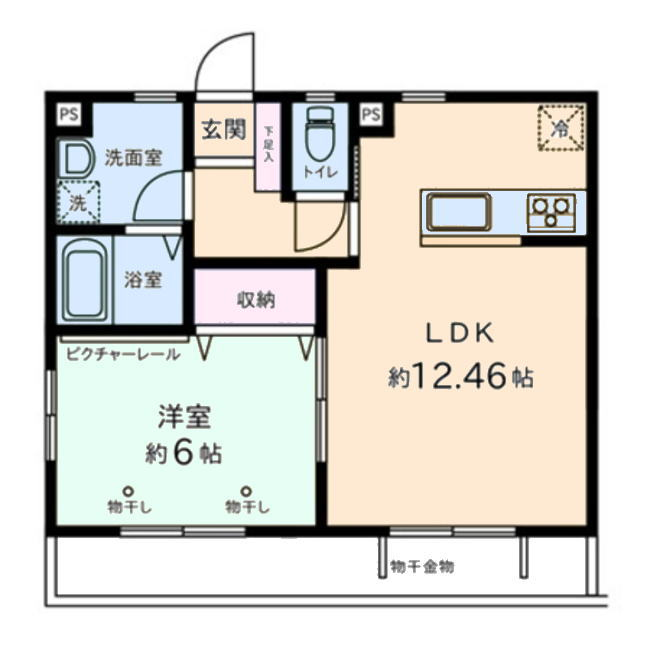 無駄のない間取りで43.06平米の1LDKなので間取りに余裕があり、12.46帖のLDKに6帖洋室と丁度よい広さです!シャッター雨戸になっており、お部屋前には防犯の砂利も敷かれています!3