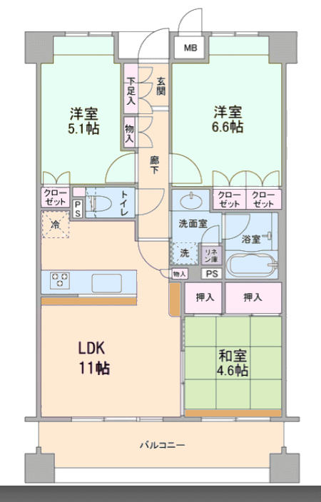 3DK 60m2 ( 18.15坪 ) |